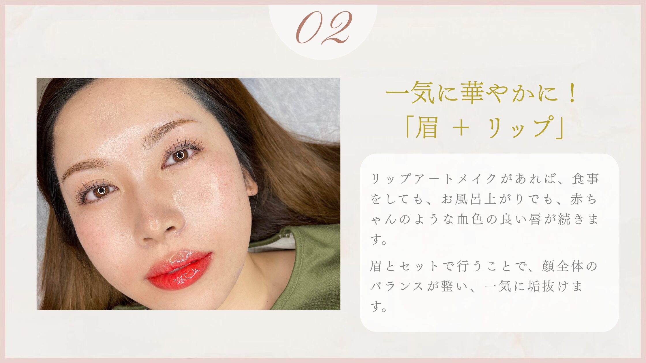 リップアートメイクがあれば、食事をしても、お風呂上がりでも、赤ちゃんのような血色の良い唇が続きます。