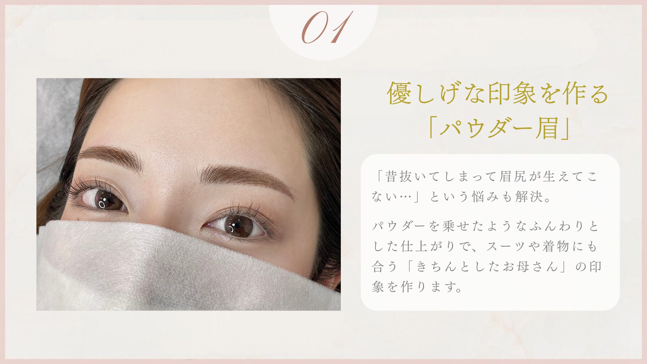 パウダーを乗せたようなふんわりとした仕上がりで、スーツや着物にも合う「きちんとしたお母さん」の印象を作ります。
